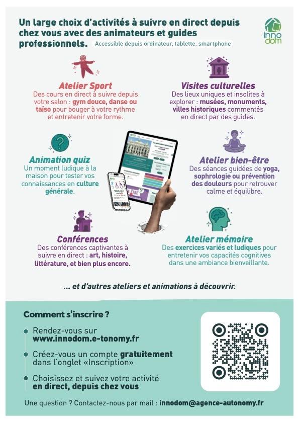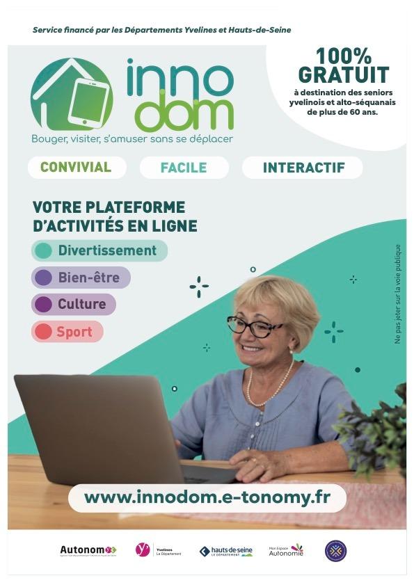 InnoDom est une plateforme interactive d’animations en distanciel totalement gratuite, car financée par le département des Yvelines et des Hauts de Seine. Elle s’adresse aux personnes de plus de 60 ans résidant sur l’un ou l’autre de ces départements. Cette plateforme, développée par l’Agence Autonomy, agence interdépartementale pour le bien vieillir à domicile, vous propose :