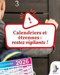 Les policiers, gendarmes, agents de l’eau, de l’électricité ou du gaz ne vendent jamais de calendrier. Par ailleurs, certaines personnes mal intentionnées profitent de cette saison des calendriers pour se faire passer pour de faux facteurs, pompiers ou éboueurs.