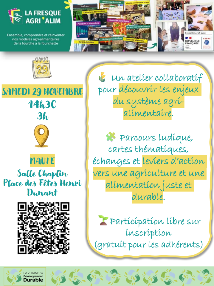 🌱 Venez curieux, repartez inspirés ! Lien vers inscription : https://www.helloasso.com/associations/la-vitrine-du-developpement-durable/evenements/fresque-agri-alim