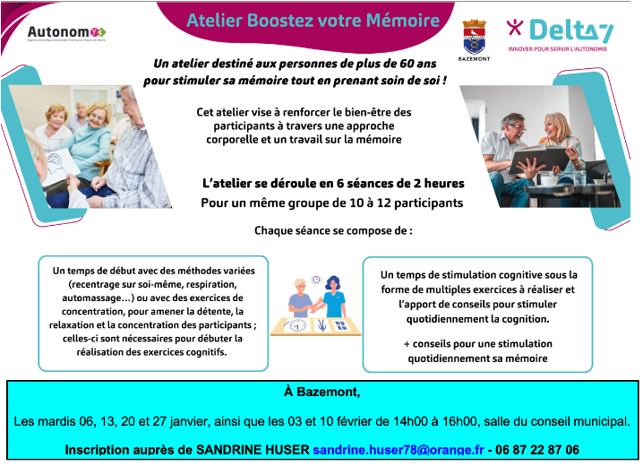 Cet atelier, gratuit, organisé par la commune et animé par un professionnel de l’association Delta 7, a pour objectif de stimuler votre mémoire tout en prenant soin de vous-même !