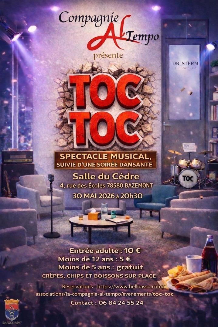 Rendez-vous à la Salle du Cèdre pour découvrir le spectacle musical "TOC TOC", une plongée rythmée dans le cabinet du célèbre Dr. Stern. La représentation sera suivie d'une soirée dansante pour prolonger la fête tous ensemble.