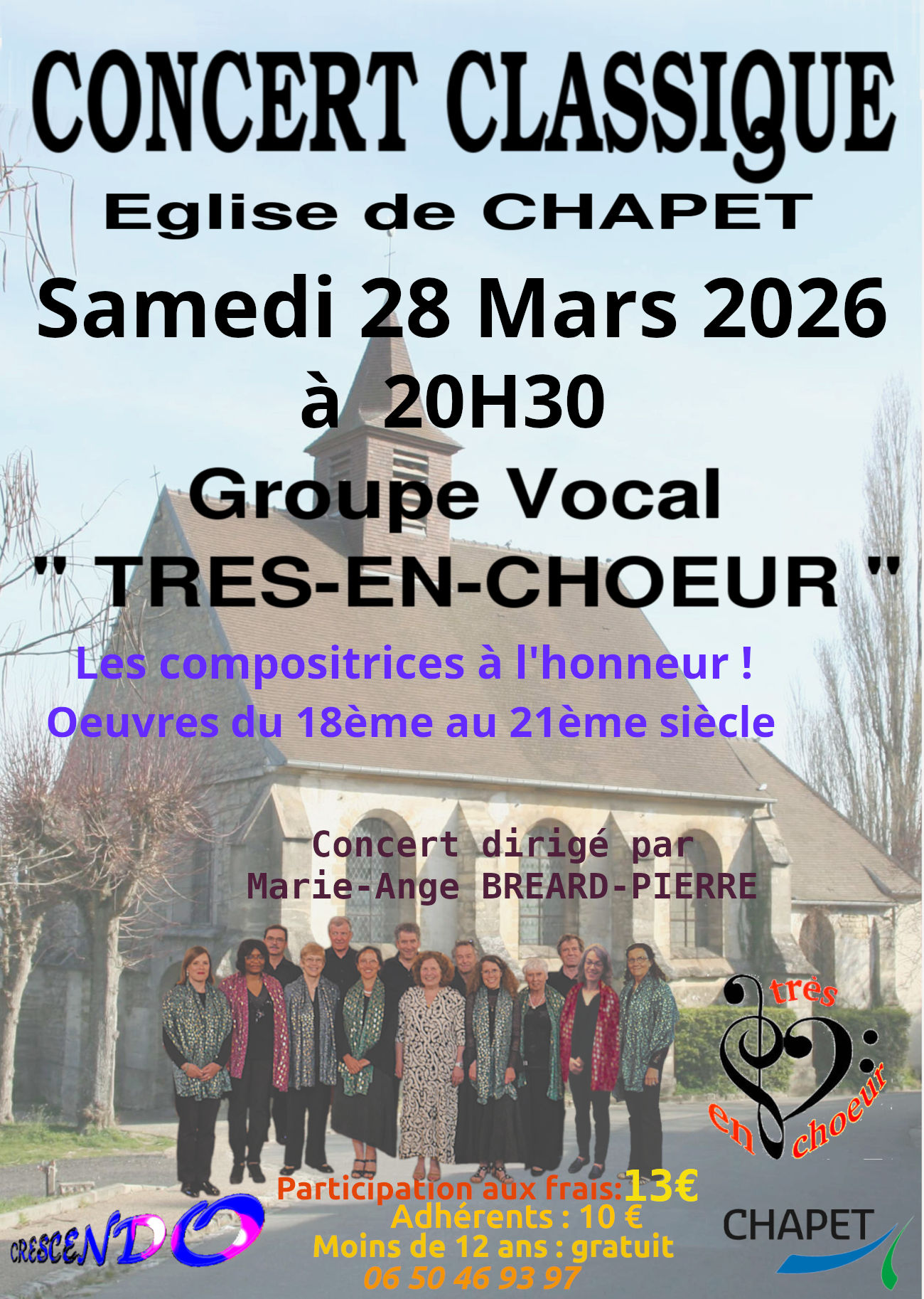 Notre prochain concert aura lieu le 28 mars 2026 à 20h30 à l'Eglise Saint Denis de CHAPET.
