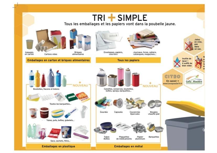 LES EMBALLAGES ET LES PAPIERS vont dans le bac à couvercle jaune